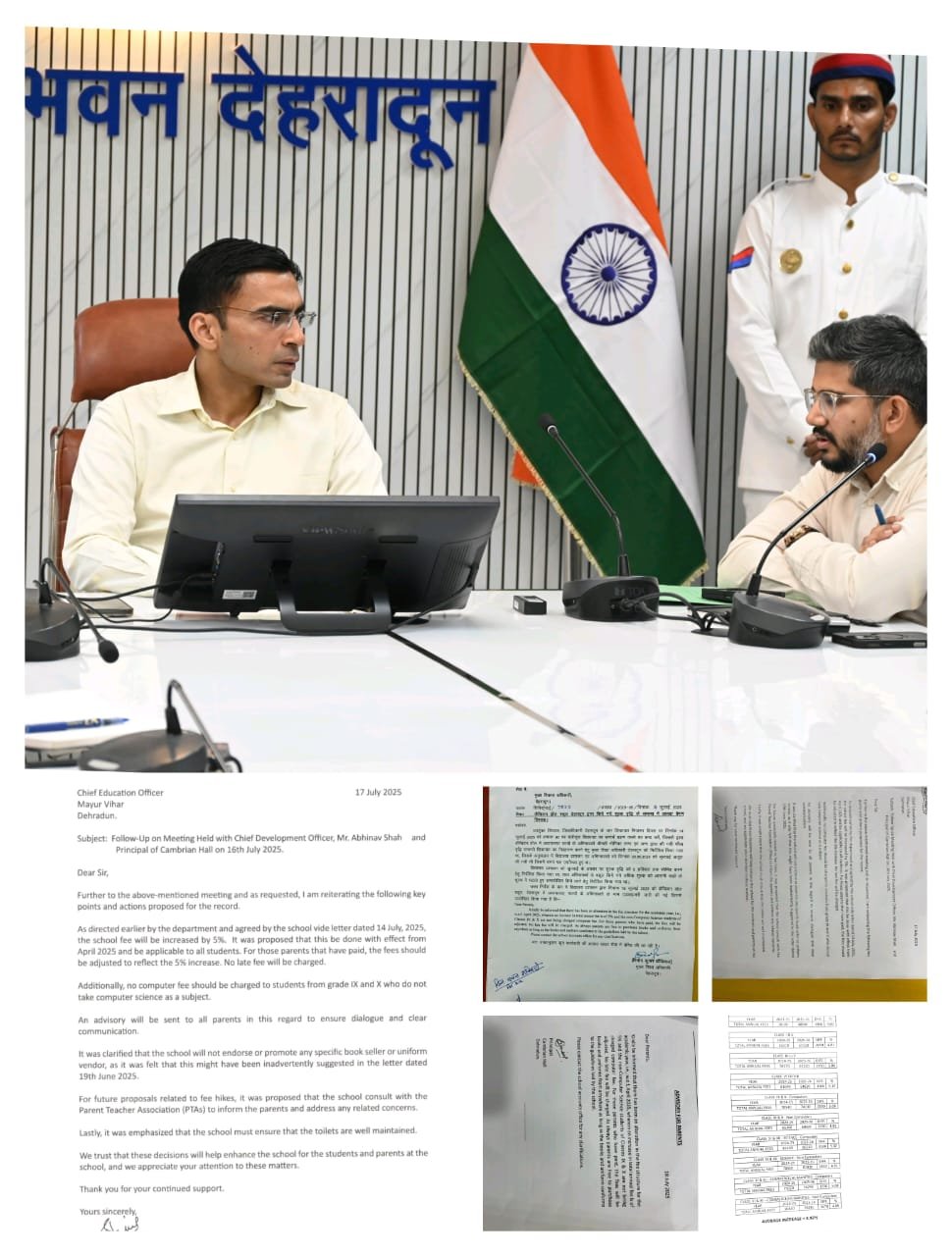 मा0 मुख्यमंत्री के निर्देश और जिला प्रशासन के आक्रामक रवैये से कैंब्रियन हॉल स्कूल अब बैकफुट पर आ गया है। स्कूल ने मनमाने तरीके से 10 प्रतिशत फीस वृद्वि को 05 प्रतिशत कम कर दिया है। जिलाधिकारी सविन बंसल के निर्देशों पर नियमों का पालन न करने वाले स्कूलों के खिलाफ कडा एक्शन लिया जा रहा है। जिला प्रशासन द्वारा स्कूल पर सख्त प्रवर्तन एक्शन के बाद अभिभावकों को बड़ी राहत मिली है।