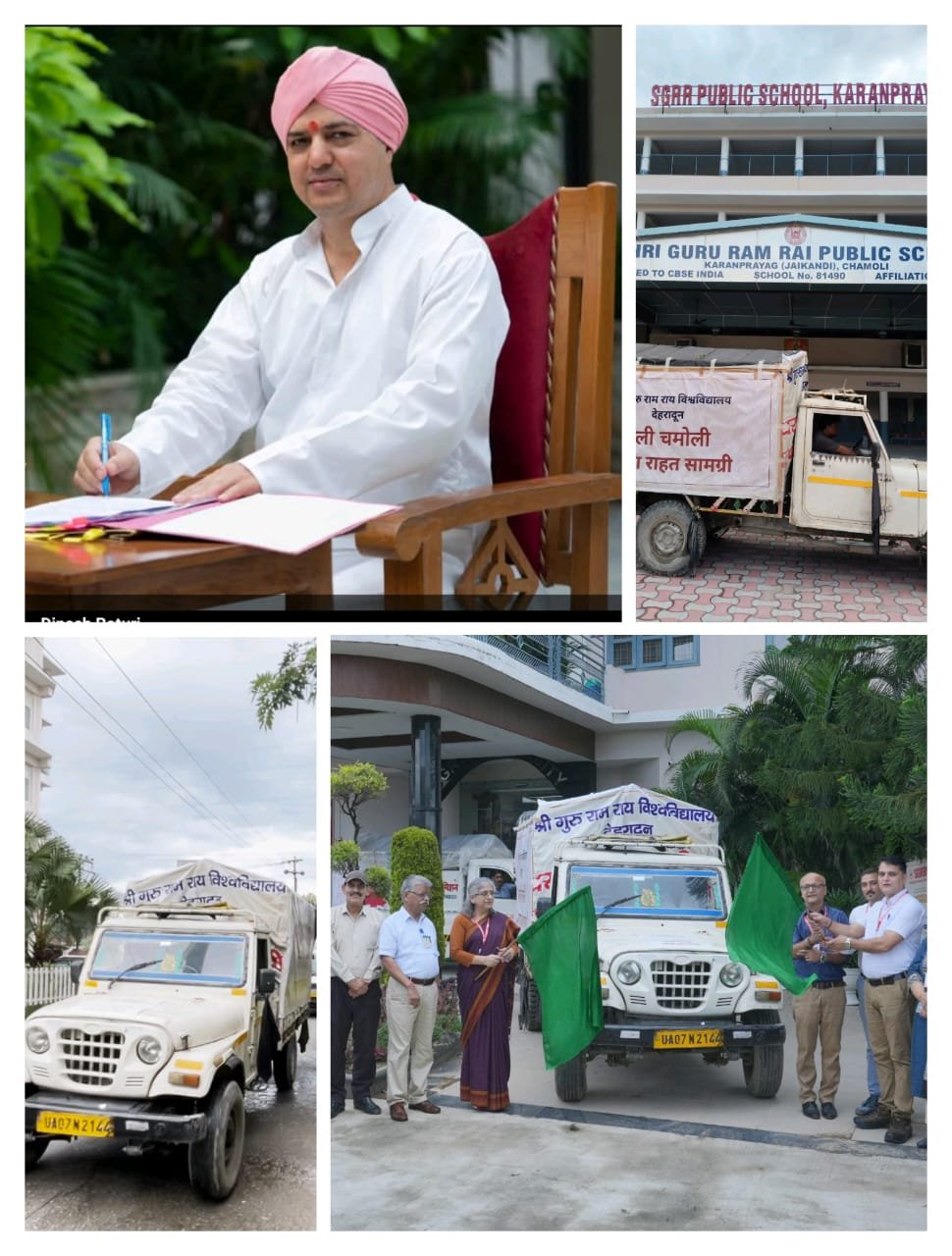 श्री गुरु राम राय विश्वविद्यालय ने थराली (चमोली) आपदा प्रभावितों के लिए राहत एवम् खा़द्य सामग्री भेजी। सोमवार को श्री गुरु राम राय विश्वविद्यालय की कुलपति प्रो. डॉ. कुमुद सकलानी और रजिस्ट्रार डॉ. लोकेश गंभीर ने राहत सामग्री से लदे वाहनों को हरी झंडी दिखाकर रवाना किया। श्री गुरु राम राय विश्वविद्यालय के माननीय प्रेसीडेंट श्रीमहंत देवेन्द्र दास जी महाराज ने कहा कि हम सभी प्रभु से प्रार्थना करते हैं कि प्रभावित परिवारों को शीघ्र ही इस कठिनाई से उबरने की शक्ति प्राप्त हो। उन्होंने चमोली जनपद के अन्तर्गत आने वाले एसजीआरआर ग्रुप के संस्थानों के कर्मचारियों का आह्वान किया कि आप सभी थराली आपदा पीड़ितों की हर सम्भव मदद में अपना योगदान दीजिए।