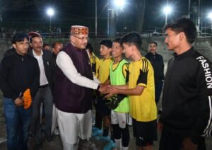 मसूरी में हैप्पी वैली स्पोर्ट्स कमेटी द्वारा आयोजित 5वाँ फुटबाल प्रतियोगिता में खिलाड़ियों से परिचय प्राप्त कर उनका उत्साहवर्धन करते कैबिनेट मंत्री गणेश जोशी